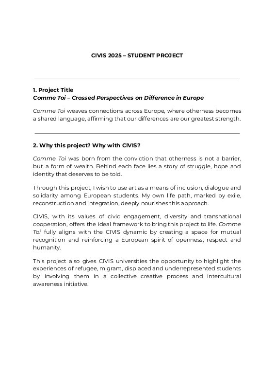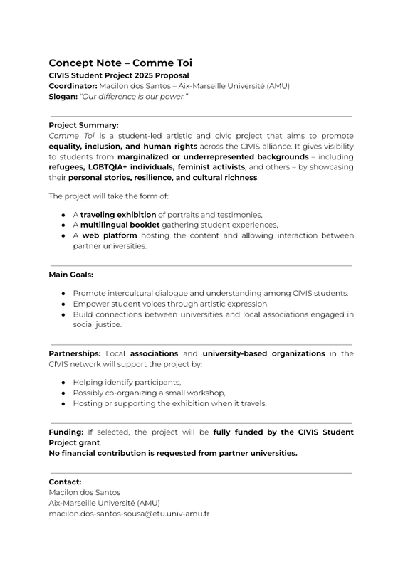 Concept Note – Comme Toi CIVIS Student Project 2025 Proposal Coordinator: Macilon dos Santos – Aix-Marseille Université (AMU) Slogan: “Our difference is our power.” Project Summary: Comme Toi is a student-led artistic and civic project that aims to promote equality, inclusion, and human rights a...