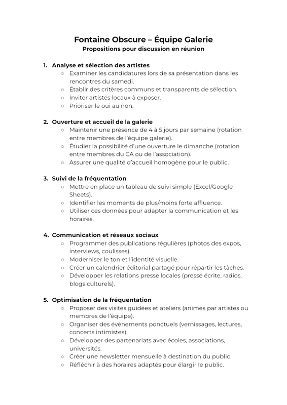 Fontaine Obscure – Équipe Galerie Propositions pour discussion en réunion Analyse et sélection des artistes Examiner les candidatures lors de sa présentation dans les rencontres du samedi. Établir des critères communs et transparents de sélection. Inviter artistes locaux à exposer. Prioriser le ...